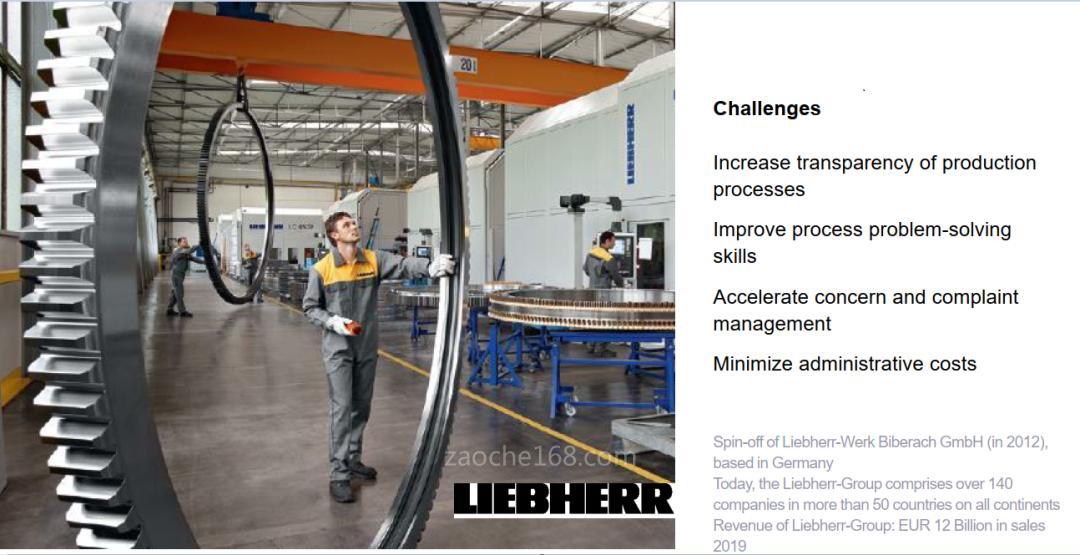 利勃海尔家族企业是世界建筑机械的领先制造商之一,全球拥有超过100家的分公司和工厂,中国的工厂位于大连市。主要产品包含塔式起重机、车载式起重机、液压吊管机、轮式装载机等。利勃海尔于2007年开始考虑实施质量管理系统,2008年选择西门子的QMS系统作为全球的质量管理软件,至今全球工厂仍在使用QMS系统。