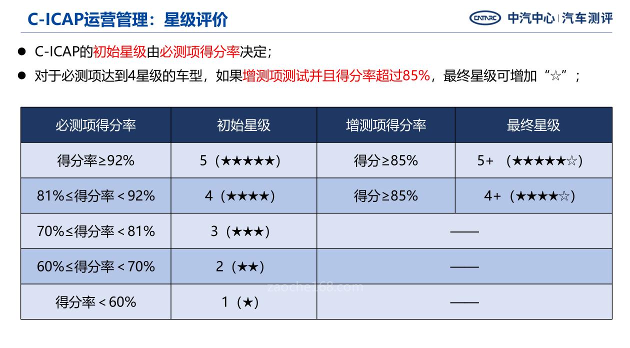 C-ICAP《中国智能网联汽车技术规程》将由中汽中心汽车测评管理中心运营,进行“统一买车、统一买车、统一评价、统一公布”。该规程将采取星级评价方式,根据必测项和增测项得分率,确定被测车型星级。