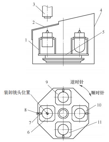 铣头库中4个托架用于承载附件铣头及防尘盖,托架上的接近传感器用于检测附件铣头及防尘盖的在库状况。伺服电动机通过同步齿形带与减速齿轮驱动头库底座旋转,附件铣头与防尘盖板在托架上随之旋转。