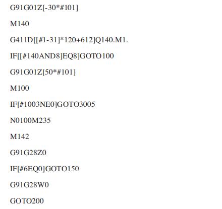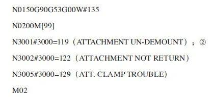 (1)在FANUC系统中查找相应宏程序[1] 报警号3119是一个由FANUC宏程序产生的报警,从这个报警信息开始分析。由报警可知,系统变量#3000中对应的值为119,根据这一线索,在FANUC系统中查找到对应的宏程序为O9301,这是一个附件铣头自动交换的宏程序。具体宏程序内容如下。