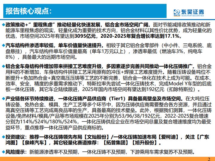 ◆铝合金车身结构件增加带来拼接工艺难度升级,多因素逐步完善共同推动一体化压铸推广。铝合金用料的不断增加,车身结构件拼接工艺采用原有的冲压+焊接工艺难度提升。随着压铸设备吨位不断提升+免加热合金+真空高压压铸等工艺的不断完善,铝合金一体化在技术上成为可能。在成本、效率、安全、精度的多重需求推动下,特斯拉率先尝试一体化压铸技术,完成Model Y车型的后底板一体化压铸,其它车企陆续跟进,2025年国内市场空间有望达到192亿元(扣除特斯拉)。
