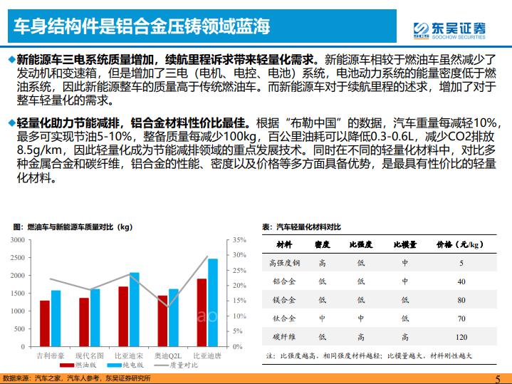 ◆政策推动+”里程焦虑”推动轻量化快速发展,铝合金市场空间广阔。面对节能减排政策推动和新能源车里程焦虑的现实,轻量化成为重要的技术方向,铝合金材料以其性价比优势,成为轻量化的优选,市场空间2025年有望达到3095亿元,2020-2025年复合增长率达到17.1%。