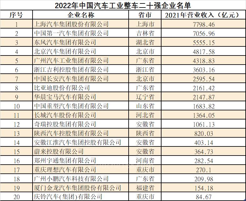 2022年中国汽车工业整车二十强企业名单
