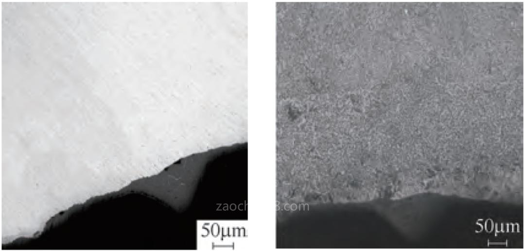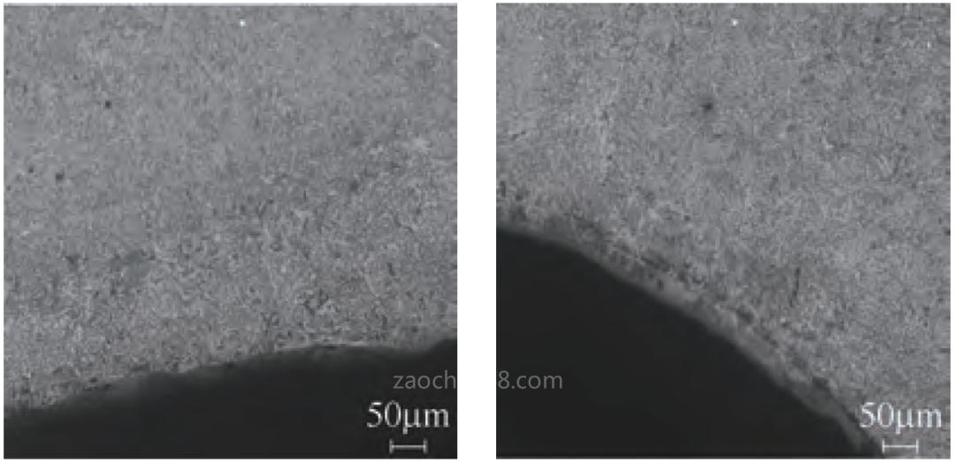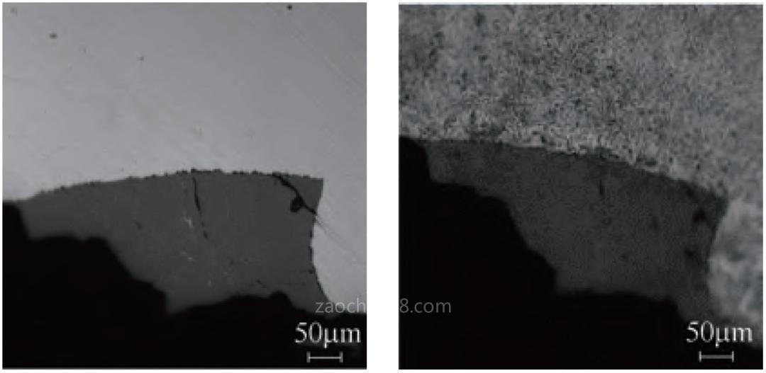 综上所述,减速机轴齿缺陷表面和内部均残余少量异物嵌入,与样品基体成分明显不同,周边组织为贝氏体,凹坑周边无明显脱碳,内侧内沿有一层氧化铁附着,缺陷底部存在大量微裂纹,由浅往深延展至底部翘皮部位。