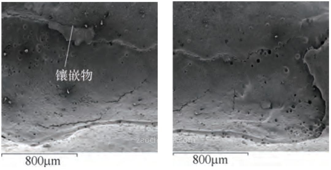 对镶嵌异物及缺陷周边进行SEM扫描电子显微镜分析,缺陷底部整体形貌如图8a所示,缺陷底部存在大量微裂纹,由浅往深延展至底部翘皮部位,如图8b和图8c所示。