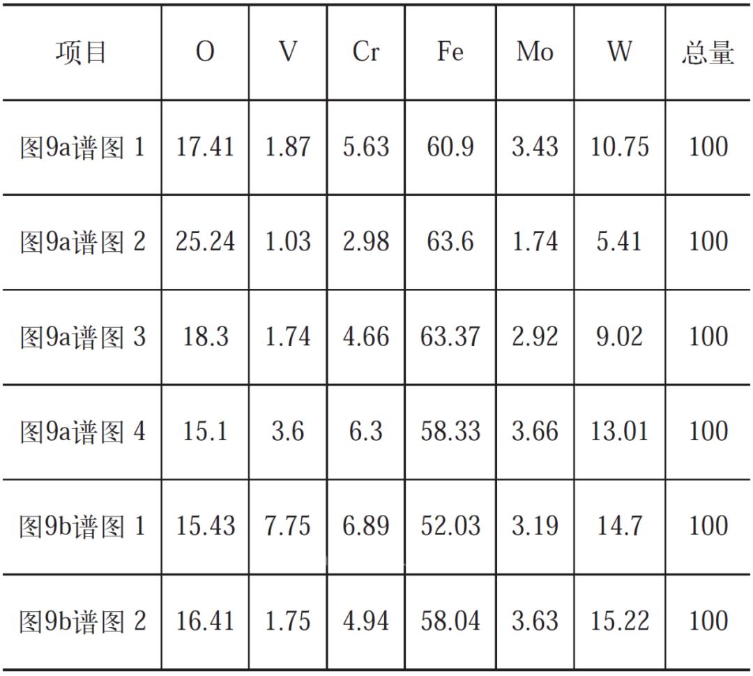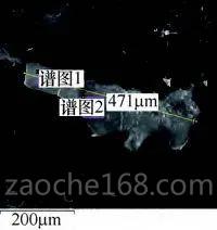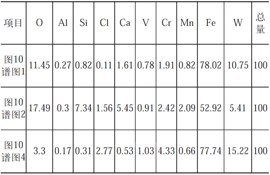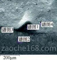 如图9所示,对镶嵌异物及缺陷周边进行能谱检验,缺陷内沿附着物及缺陷底部为氧化铁;缺陷底部存在异物残留,尺寸约0.47mm;异物组织与样品基体组织有明显不同,见表2。
