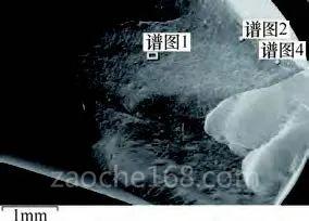 取图1a中白线所示位置的横截面为金相面进行检验,缺陷位置存在异常贝氏体组织,宽度约为1.5mm,如图2所示;缺陷表面存在一处异物镶嵌,经4%硝酸酒精试剂腐蚀后异物未被腐蚀,周围基体组织为贝氏体,如图3、图4所示;正常基体和正常轴齿尖部组织均为铁素体+珠光体[1],如图5所示。