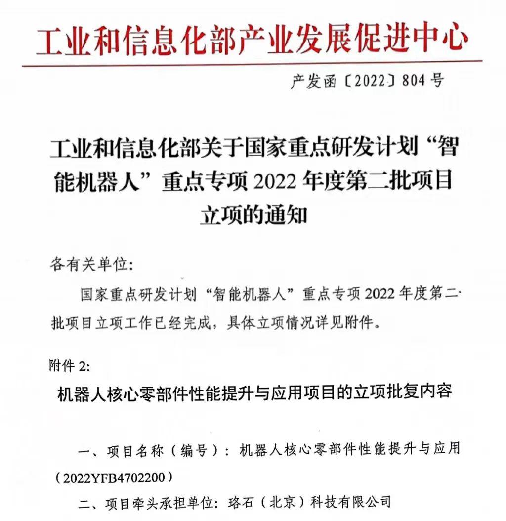 近日,珞石机器人牵头申报的国家重点研发计划“智能机器人”重点专项“机器人核心零部件性能提升与应用”项目正式获批立项!这是继参与多项国家重点研发计划后,珞石机器人在国家级项目申报方面的又一里程碑!