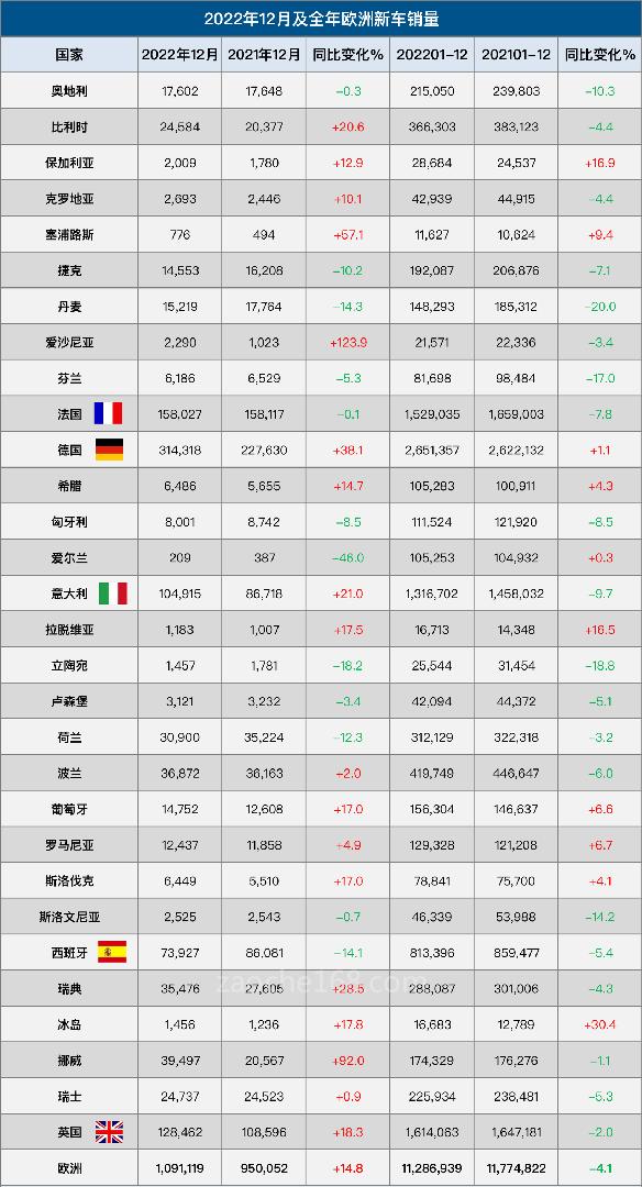 1月18日,欧洲汽车制造商协会(ACEA)公布的数据显示,2022年12月份,欧洲新车注册量约为109.1万辆,同比增长14.8%。尽管欧洲车市年末连续五个月保持增长,但由于受上半年零部件短缺的影响,2022年全年欧洲新车注册量同比下跌4.1%,至1128.7万辆。