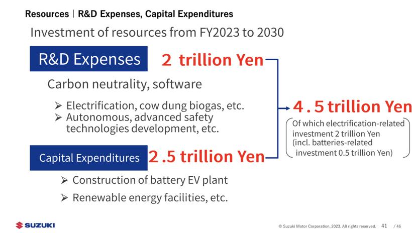 铃木汽车表示,将在电气化和自动驾驶技术上投资2万亿日元,同时支出2.5万亿日元建设一座纯电动汽车工厂和可再生能源设施。在用于电气化的资金中,铃木汽车将把其中5000亿日元投资于电池。