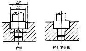 4.转折处结构零件两个方向的接触面在转折处应做成倒角、倒圆或凹槽,以保证两个方向的接触面均接触良好。转折处不应都加工成直角或尺寸相同的圆角,因为这样会使装配时转折处发生干涉,以致接触不良而影响装配精度。如图4所示。