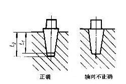 由于锥面配合能同时确定轴向和径向的位置,因此当锥孔不通时锥体顶部与锥孔底部之间必须留有间隙。如图2所示,必须保持L2>L1,否则得不到稳定的配合。