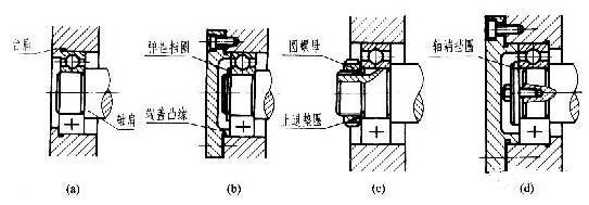 为了防止滚动轴承产生轴向窜动,必须采用一定的结构来固定其同圈、座圈。常用的轴向固定结构形式有:轴肩、台肩、弹性挡圈、端正党风盖凸缘、圆螺母和止退垫圈、轴端挡圈,如图6所示。孔和轴用弹性挡圈的标准尺寸,可从标准中查取。为了使滚动轴承转动灵活和热胀后不致卡住,应留有少量的轴向间隙(一般为0.2~0.3mm),常用的调整方法有:更换不同厚度的金属垫片或用螺钉止推盘等。
