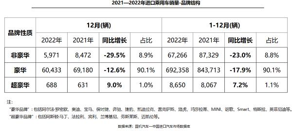在进口车市场,豪华品牌仍是主力,占比90.1%,2022年累计销售69.2万辆;其次是非豪华品牌,占比8.8%,累计销售6.7万辆;超豪华品牌虽仅占1.1%,但同比呈正增长,相较2021年增长7.2%至8650辆,尤其在宾利飞驰销量显著增长带动下,12月超豪华品牌出现同比大幅增长,涨幅达9.0%。