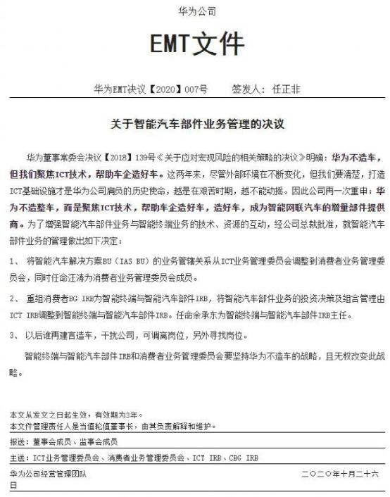 网上公布的这份文件是华为创始人任正非签发的【2018】139号华为EMT决议。值得一提的是,在声明末段处标明“本文从发文之日起生效,有效期为3年”。那么似乎意味着,如今距离这份文件所承诺的时间还剩8个多月,不造车这个“枷锁”马上就可以脱下来。