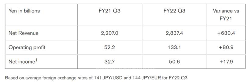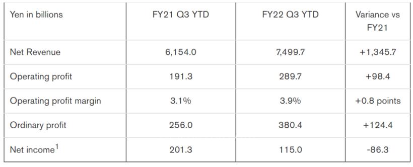 由于强劲的汇率波动和原材料价格上涨,再加上半导体供应长期短缺和新冠肺炎疫情蔓延,影响了生产,日产前三财季净利润低于去年同期。尽管面临这些挑战,日产仍在稳步推进其日产NEXT业务转型计划。由于不断努力提高销售质量和优化成本,其主要车型的净收入不断提高。此外,财务纪律和严格控制固定成本,加上日元贬值到高于预期水平的积极影响,使整体业绩与上一财年相比有了显著改善。