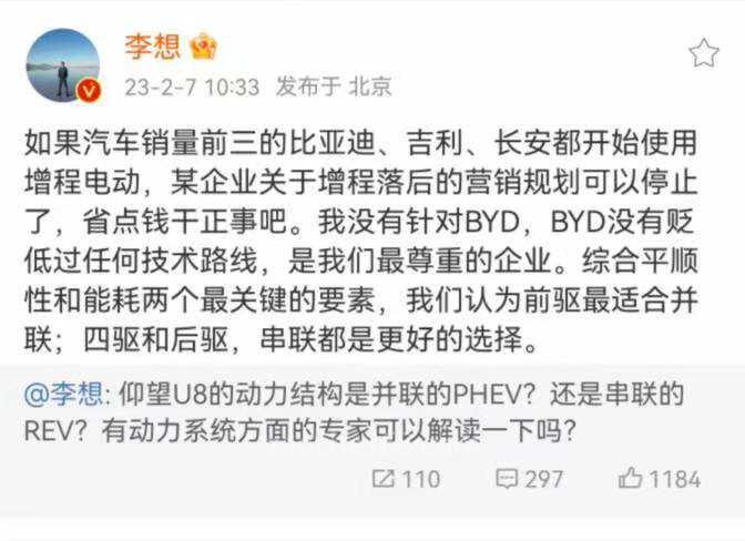 理想L7上市前一天,李想在微博自问自答,一番含沙射影的同时,还进行了一波增程式的自我营销。不得不说,借力比亚迪仰望U8,再把吉利、长安拉到同一阵营,李想算是把流量玩得明明白白。