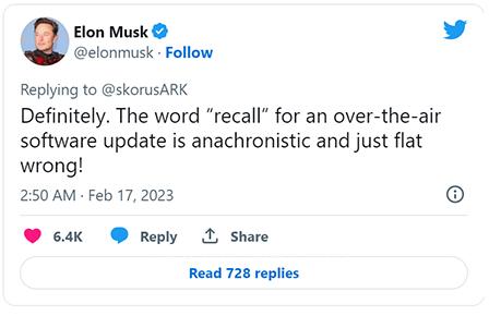 对此,特斯拉首席执行官马斯克当天在推特上表示,“召回”一词是“完全错误的”,因为这些问题可以通过OTA来解决。