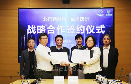 2月16日,北京新能源汽车股份有限公司(简称“北汽新能源”)与广州巨湾技研有限公司(简称“巨湾技研”)在北京签署战略合作协议。北汽新能源党委书记、总经理代康伟,首席技术官陈上华,巨湾技研董事长黄向东、总裁裴锋等双方公司领导及嘉宾出席活动。