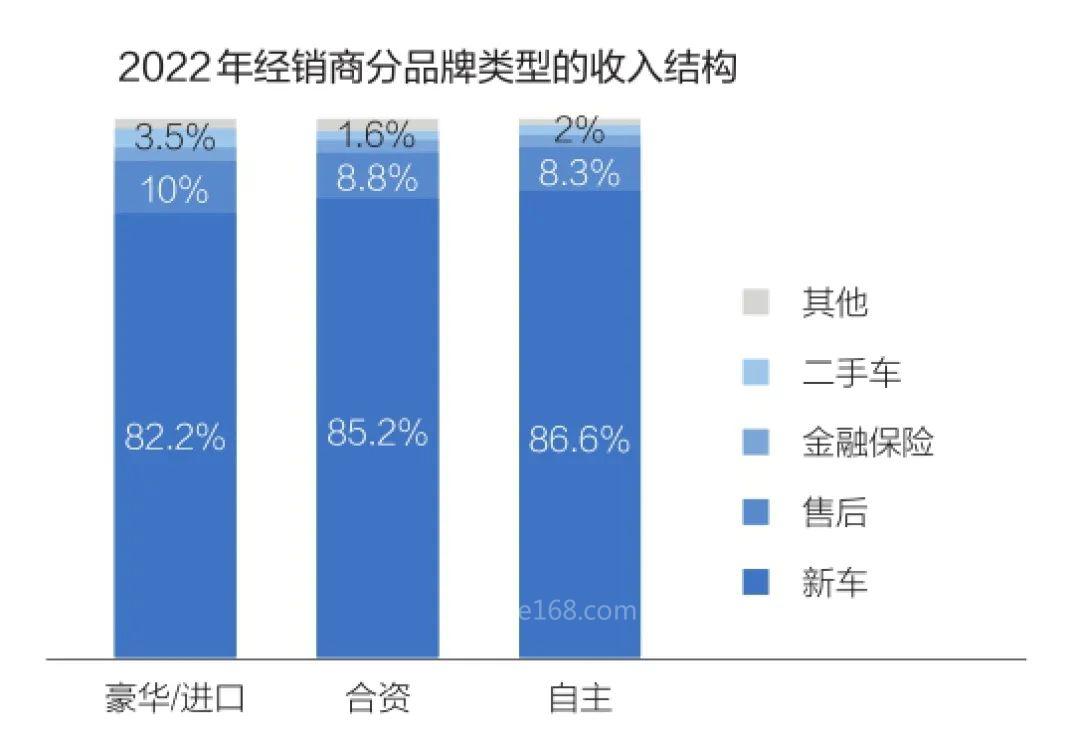 值得注意的是,2022年经销商新车销售收入占比为82.9%,同比上涨1.8个百分点;售后收入占比为9.7%,同比下滑0.6个百分点。郎学红分析,新车销量占比提升并非收入增长所致,而是其他收入板块下滑造成的。2022年,我国3亿多辆存量汽车使用频次大幅减少、行驶里程大幅降低,由此导致门店事故车维修和保养台次下滑,4S店售后服务收入受到很大冲击。在三类品牌中,自主品牌新车贡献度最高,达到86.6%,豪华/进口品牌售后服务的贡献度最好,达到10%。