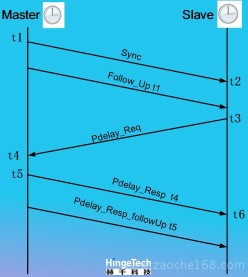 (1)主时钟向从时钟发送Sync报文,并记录发送时间t1;从时钟收到该报文后,记录接收时间t2。(2)主时钟发送Sync报文之后,紧接着发送一个携带有t1的Follow_Up报文。 (3)从时钟向主时钟发送Pdelay_Req报文,并记录发送时间t3;主时钟收到该报文后,记录接收时间t4。(4)主时钟收到Pdelay_Req报文之后,回复一个携带有t4的Pdelay_Resp报文,并记录发送时间t5;从时钟收到该报文后,记录接收时间t6。(5)主时钟回复Pdelay_Resp报文之后,紧接着发送一个携带有t5的Pdelay_Resp_Follow_Up报文。