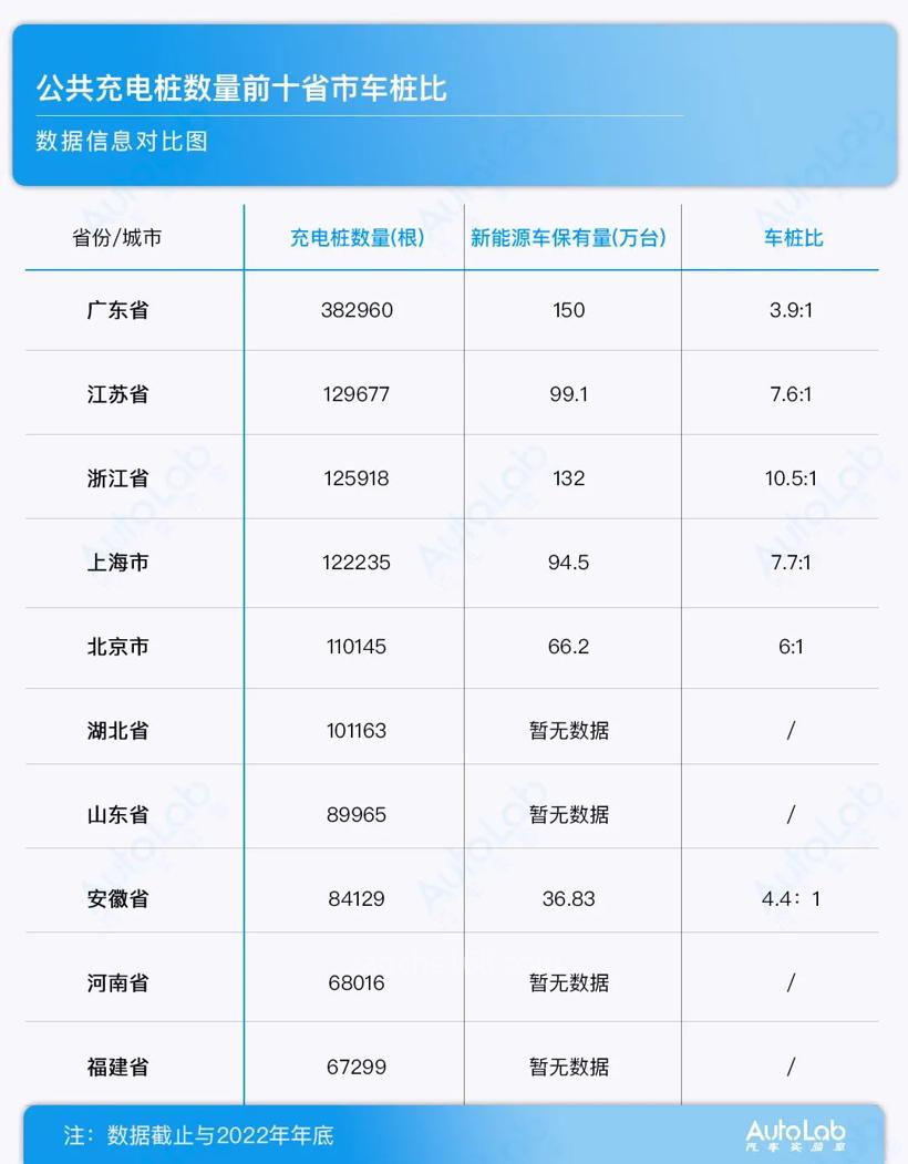根据2022年中国充电联盟数据来看,广东省拥有38.2万根公共充电桩位居全国首位,但同时广东省新能源车保有量也超过150万,车桩比约为3.9:1,与2:1也相距甚远。