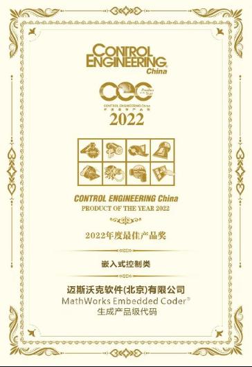 中国工控自动化领域权威的年度产品评选活动 —— CONTROL ENGINEERING China 2022(第十八届)年度最佳产品奖颁奖典礼中,MathWorks 凭借 Embedded Coder® 代码生成工具箱,获嵌入式控制类最佳产品奖。CEC 评选是中国工业控制、自动化和仪器仪表领域最具权威性的产品评选活动之一,秉承规范、公正、透明的评选宗旨,该活动涌现出了非常多的具有技术代表性、标志性、里程碑式的产品,为广大用户的技术升级、产品选购提供了决策指导作用。
