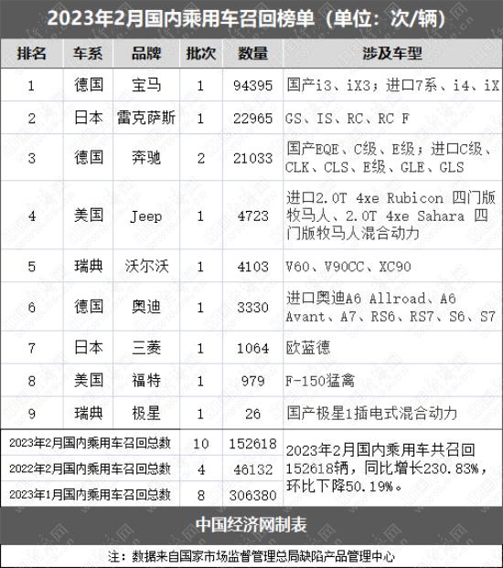 据国家市场监督管理总局缺陷产品管理中心数据,2月,国内共有9家品牌累计发布10起公告,共召回乘用车152618辆,同比增长230.83%,环比下降50.19%,依旧延续低位运行。