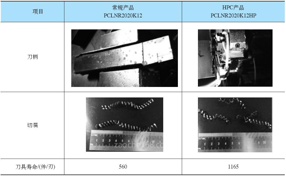 加工效果:虽然冷却压力非常小,但是即使这样的情况下,同样的刀片,同样的参数,该刀具寿命也获得了翻倍的效果,而且切削断屑也比之前的要更短。与常规产品相比见表2。