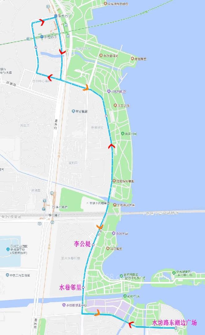 该公交示范应用线路位于星洲街与水坊路之间,贯穿东方之门、苏州中心、李公堤等重要商业体。