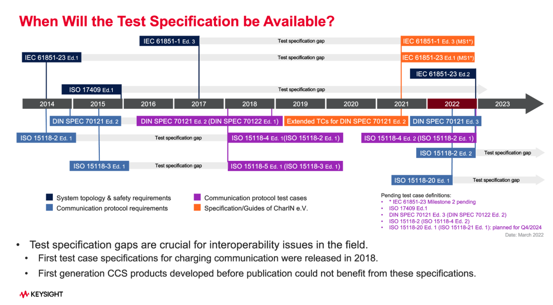 这里我们整理了与CCS相关数字通信标准的发布时间线,可以相对直观地看出标准的对应及迭代关系。从上图可以看到从标准发布到一致性测试标准的推出还会经历一段时间的空窗期。针对ISO 15118-20的一致性测试标准已经在2022年2月启动了起草工作,是德科技也参与其中。不久的将来在一致性测试标准正式发布时是德科技也将及时跟进提供相应的一致性测试方案。