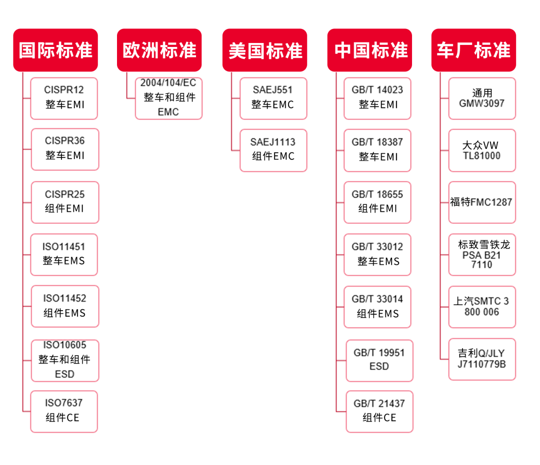 整车电磁辐射发射测试、整车辐射抗扰度测试、汽车电子EMI传导发射测试、汽车电子辐射发射测试、汽车电子辐射抗扰度测试、汽车电子瞬态发射传导测试、汽车瞬态传导抗扰度测试、整车大电流测试、汽车电子近距离辐射抗扰度测试、汽车电子静电放电抗扰度测试等。