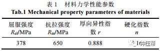 较大的尺寸、 较厚的金属板、复杂的形状结构和较高的成形精度是某汽车纵梁产品模型的显著特征,可将该模型作为一 般拉深成形的特例进行模拟与分析。为了降低汽车的车身质量,常采用大尺寸汽车梁和较薄的高强度钢板材料,所以回弹现象变得特别明显,因此,如何最大限度地减少回弹成为研究的重点。2.2 纵梁板料参数纵梁板料为双相钢 B340/590DP1.6,其力学性能参数见表 1。运行 AutoForm 软件的自动成形模块对数值模拟参数进行设置,通过偏置创建出凸模与压边圈参数并设置凹模参数,采取压边力控制法,凸模移动速度为 5000 mm/s,压边力为 2350 kN,摩擦因数取 0.15。