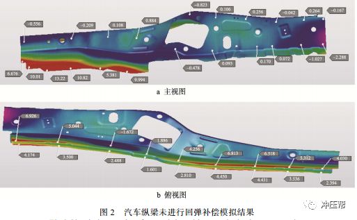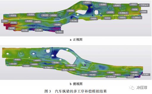 2.4 进行回弹补偿时板件的回弹分析 基于 AutoForm 分析得到的回弹结果,针对汽车纵梁的多工序采取多次补偿,最终达到合格要求,如 图 3 所示。
