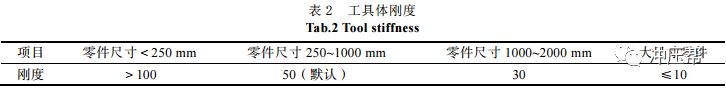 3 基于计算机辅助工程的回弹补偿技术 高强钢板制件的回弹控制主要从以下 3 个方面 入手,任何方面的出错都将导致回弹控制出现失真、 失控,因此这 3 个方面都必须进行严格控制。文中以 高强板双向钢 B340/590DP 料厚 1.6 mm 的纵梁为例进行详细阐述。3.1 前处理 前期的工艺分析精度设置、工具体刚度 Tool Stiffness 设置、压力设置、工序的设置、回弹之后的 工序重力加载设置、实体筋设置等必须进行严格设 置,以确保分析得到的结果真实有效,为回弹补偿提 供指导依据。1)精度设置时,必须在 FV 中更改相应框选的 参数,结果输出全部打开 All on,除去热成形温度选 项,滑移线手动设置 100 mm。2)工具体刚度(Tool Stiffness)设置,所有弹性 原件包括压边圈、压料板均需要设置刚度值,不能完 全使用默认值 50 MPa/mm,刚度设置见表 2。