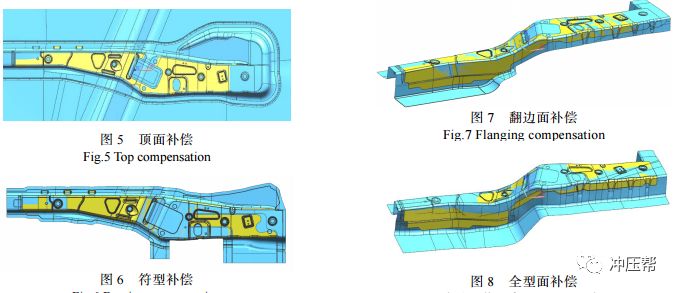 Op10 拉延工序对顶面进行了补偿,黄色为产品 面,浅蓝色为加工面,如图 5 所示。Op20 修边工序进行了符型补偿,局部进行了避空处理。黄色为产品 面,浅蓝色为加工面,如图 6 所示。Op30 翻边工序 对翻边面进行了补偿,黄色为产品面,浅蓝色为加工 面,如图 7 所示。Op40 侧整形工序对制件进行了全型面补偿,并将回弹值控制在公差范围内。黄色为产品面,浅蓝色为加工面,如图 8 所示。