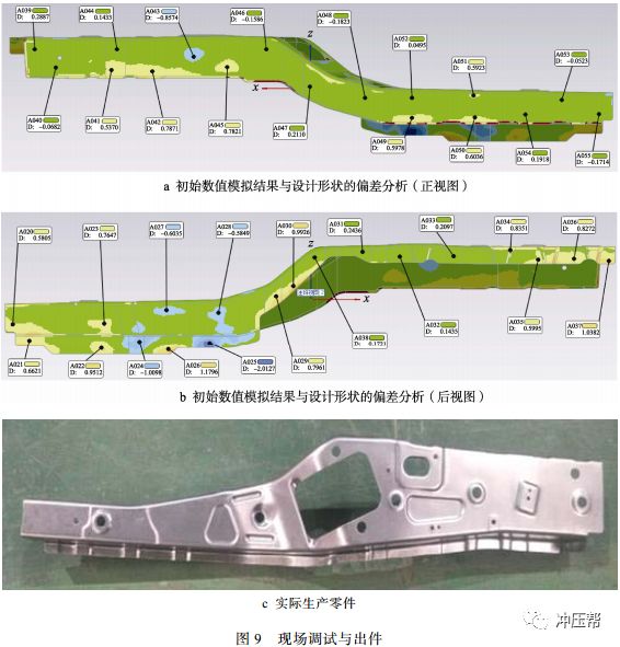 3.3 现场调试阶段 现场调试过程中只允许对模具型面进行轻微打磨,不允许使用砂轮机对模具进行打磨。通过严格控制,对现场出件进行扫描验证,测量结果显示误差在 可控范围内,经过进一步的局部改动即可达到制件合格率,如图 9 所示结论 1)对某型汽车纵梁在多步成形工艺有限元分析的基础上进行冲压试验,试冲出的产品质量满足要求,数值模拟与试验结果表明设计的多步成形工艺方案可行。2)经过多次回弹补偿,纵梁的最大回弹由补偿前的 13 m 减小至±0.5 m 以内,回弹补偿效果较为显著。回弹补偿的应用使回弹量得到了严格的控制,提高了纵梁的成形精度。