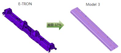 空气室下板取消加大了机舱内部布置空间;钢材改为塑料重量可下降40%;空气室取消设计虽然重量下降,有利于布置,但会对车身扭转刚度不利影响,有利也有弊。
