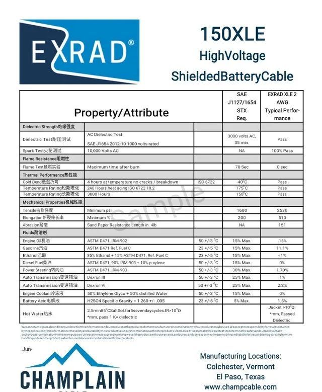 Champlain开发的EXRAD ERGOFLEX 辐照交联聚烯烃绝缘材料。这种材料化学与加工技术相结合,使得最终产品能够满足柔韧性、ISO-19642合规性、带材性能和压缩永久变形特性的所有要求。另外,它比许多现有产品的成本更低。对现有三元乙丙橡胶材料的并排测试表明,EXRAD ERGO-FLEX 实际上是更灵活,更小,更轻。