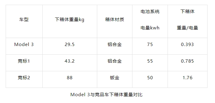 Model 3的轻量化由电池包开始,拓展到车身、底盘、电子电器等各个方面,电池减重是其重点。