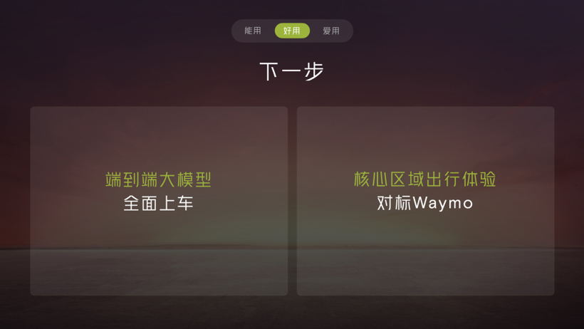何小鹏说他不久前去过美国,体验了谷歌Waymo的自动驾驶,发现Waymo已经非常接近于人类驾驶,在城区内做到数百公里采用接管1次。因此何小鹏给团队内部定了一个非常有挑战的目标:在核心区域,比如北上广深等多个中大城市的出行体验,可以对标Waymo,能够99%的时间都完全不用开车,也不用认真地去关注前方,也就是要做到更大范围,并且成本更低。这对所有人来说是巨大的变化。