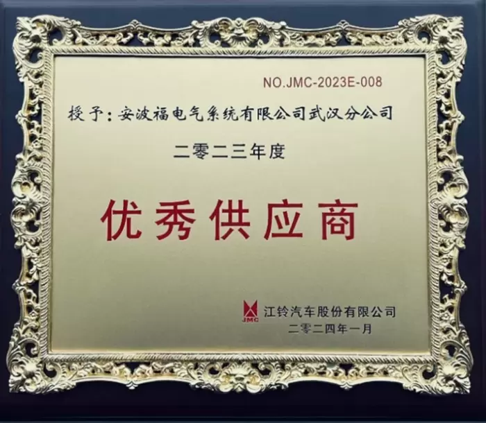 凭借扎实的质量体系、现场管理和产品交付等综合实力,安波福武汉工厂收获了一枚极具里程碑意义的官方认证——福特汽车Q1供应商资格,这不仅是福特汽车公司给予其供应商在质量领域的最高殊荣,更是汽车行业中供应商产品质量评估认证极有影响力的标杆,以及全球汽车零部件制造企业追求的目标。此外,武汉工厂也因精准落实江铃汽车倡导的“提质,降本,增效”理念,被其授予2023年度“优秀供应商奖”,该奖项是江铃汽车颁发给供应商的最高赞誉。