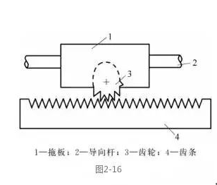 齿轮齿条装置中(图2-16),如果齿条固定不动,当齿轮转动时,齿轮轴连同拖板沿齿条方向做直线运动。这样,齿轮的旋转运动就转换成拖板的直线运动。拖板是由导杆或导轨支承的,该装置的回差较大。