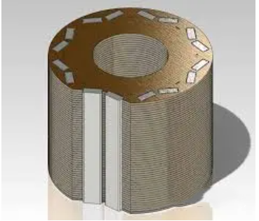 这个电机技术叫做:电机铁芯的冲片粘胶技术。电机,这里特指的是永磁同步电机只,因其物理结构特性,永磁同步电机是由一层层的硅钢片叠放起来的,中间带有容纳永磁体以及主轴的开槽。