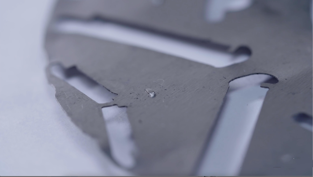 目前所有电机都可以在硅钢片上做文章,因为电机的使命是永磁体磁感线参与切割,而一旦磁场会在铁心内部闭合形成涡电流。生成热量,相当于就浪费掉了。这也是所谓铁耗的来源之一,但电机设计有一个权衡点,就是束缚住永磁体的边肋宽度越小磁通越饱和磁场效果越好,但如果设计得太薄了,强度会变差,能看出来下图这个电机的槽已经非常窄了。