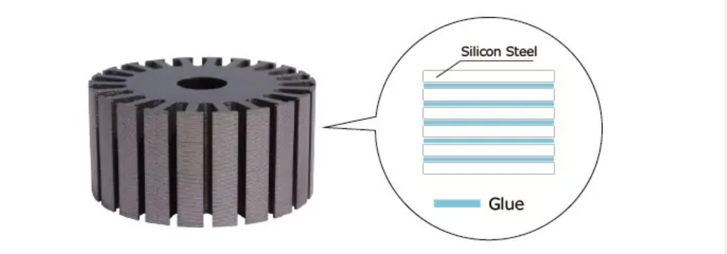 之前很多电机采用类似榫卯结构的叠片形式,两侧的突出部会使电机在整个转子部分产生涡电流,现在多数电机都会采用了新型涂胶方式,这样不用在冲片上打出突出部,这样涡电流就仅仅在每片冲片上自己转,磁通量很小发热量就有限,未来这种粘胶方式是主流。
