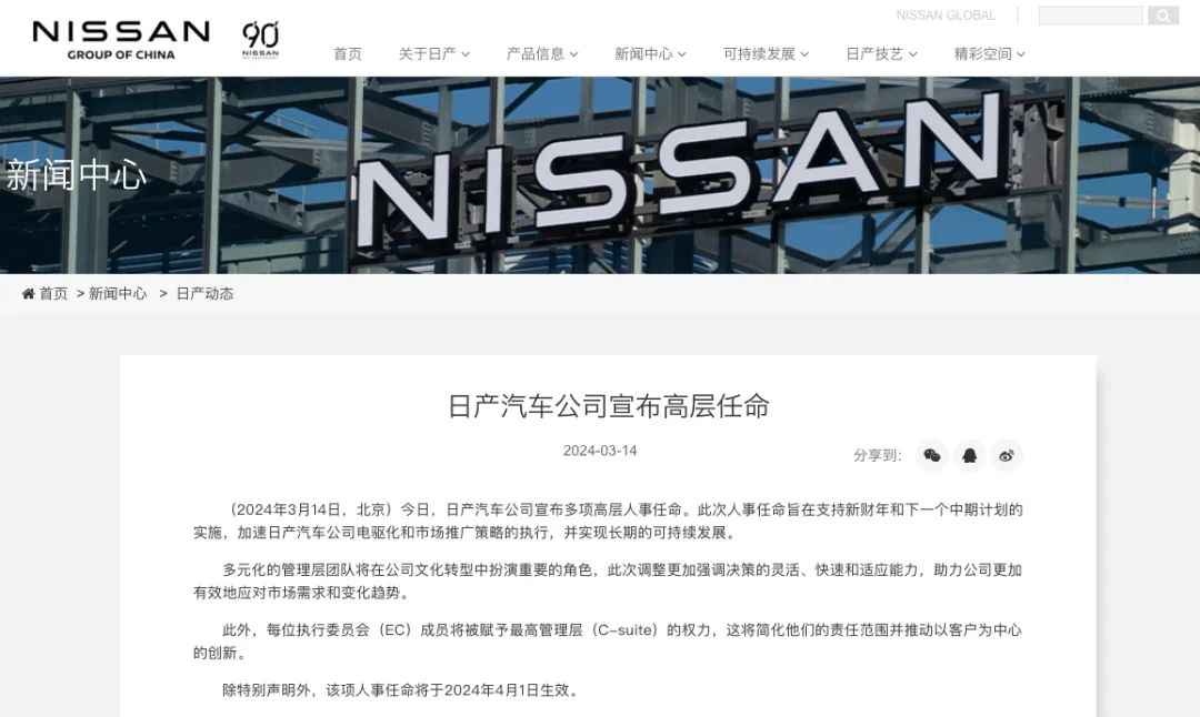 对于人事调整,官方称,人事任命旨在支持新财年和下一个中期计划的实施,加速日产汽车公司电驱化和市场推广策略的执行,并实现长期的可持续发展。