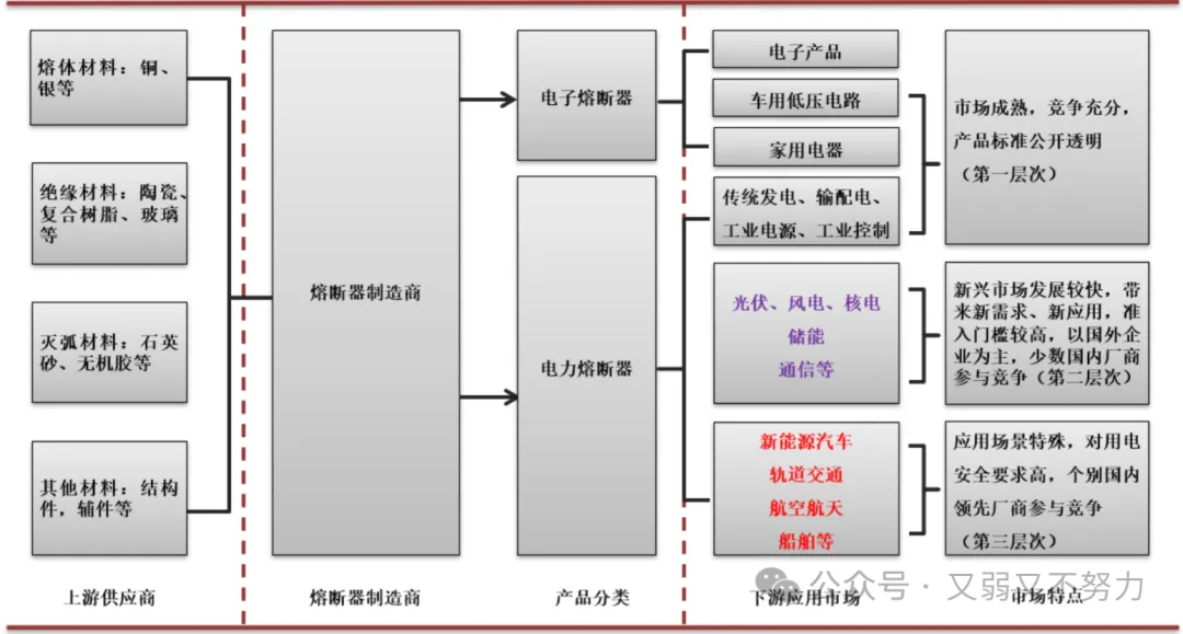 熔断器主要由熔体、灭弧介质、M效应点、绝缘管壳、接触端子和指示器组成。根据中熔电气2021年4月招股书,熔断器产业链如下: