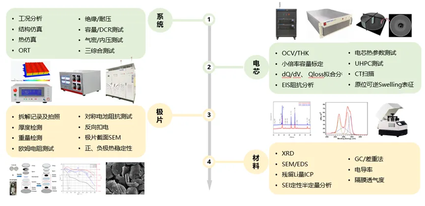 目前关于交流纹波对电池老化机制影响的研究较少,一般来说,对电池做全尺度、深层次的失效分析,应从系统到材料、从无损到有损的多维度方法矩阵入手,如图4所示。系统及Pack层面可进行基本的工况分析、绝缘耐压、结构仿真、热仿真、气密内压等及三综合等测试,在电芯层面可满足电芯热参数、EIS阻抗分析、容量标定、UHPC、CT扫描及电芯OCV、厚度及Swelling表征等,同时应对电芯进行拆解,记录拆解过程、制作反向扣电、正负极极片电性能、热性能等极片性能分析,甚至还要包括电极材料XRD、表面形貌、ICP及SEI膜定性半定量分析等微观表征方法。