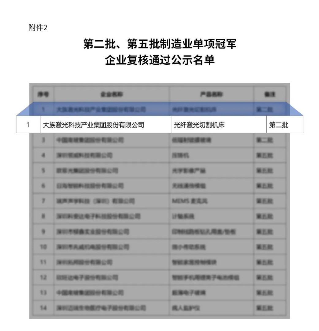近日,深圳市工业和信息化局发布《关于第八批制造业单项冠军企业和通过复核的第二批第五批制造业单项冠军企业名单的公示(深圳市)》,大族激光又一次通过审核,光纤激光切割机床入选国家级“制造业单项冠军企业”公示名单。这是大族激光连续三届(2018年-2020年、2021年-2023年、2024年-2026年)获评制造业单项冠军(产品)认定。